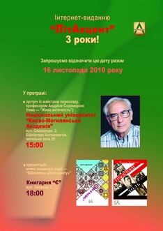 ·18.00 Презентація нової книжкової серії «Бібліотека «ЛітАкценту». У рамках заходу буде презентовано монографію Наталі Кузякіної про Миколу Куліша «Траєкоторії доль» та книгу поезій переможця книжкового рейтингу «ЛітАкцент року–2009» Петра Мідянки «Луйтра в небо».