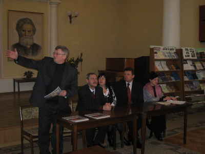 Митець передав директору Чернігівської обласної універсальної наукової бібліотеки ім. В.Г.Короленка Інні Аліфіренко примірники буклетів «Меморіал «Пам’яті Героїв Крут» і про музей морських катастроф у Криму.