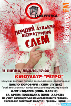 11 липня о 17.00 в приміщенні кінотеатру «Ретро» (Луцьк, вул. Кафедральна, 12) проводитиметься ПЕРШИЙ луцький літературний СЛЕМ «Табуретка».