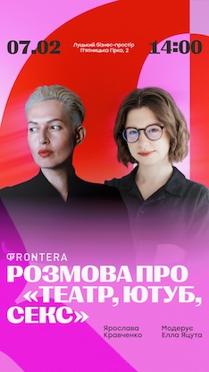 У суботу, 7 лютого о 14:00 у Луцькому бізнес-просторі (вул. П’ятницька гірка, 2) відбудеться публічна розмова «Театр, ютуб, секс» за участі авторки однойменної книжки, теле- і радіоведучої, продюсерки та громадської діячки Ярослави Кравченко.
